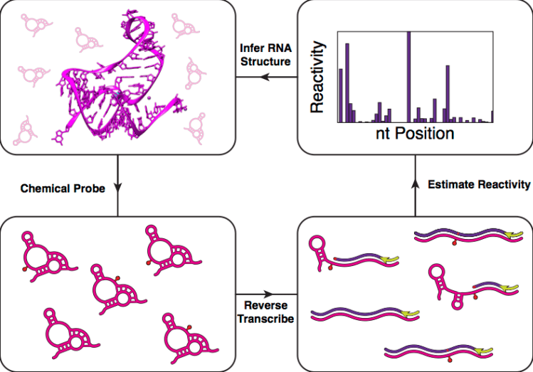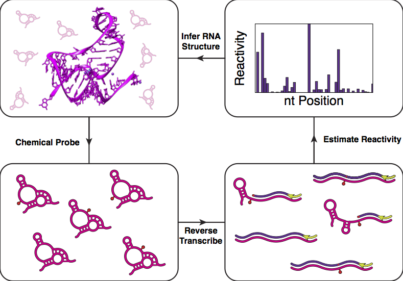Figure: High throughput RNA structure determination begins by chemically or enzymatically probing RNA structures. Positions that are flexible or unpaired are modified by the probe or enzyme. Reverse transcription and sequencing are then used to map the probe positions and estimate a ‘reactivity’ for each nucleotide in the RNA. High reactivities indicate unstructured positions, while low reactivities could be structured, stacked, or interacting with other molecules. This information can be obtained for thousands of RNAs in a single experiment and powerfully be used to uncover structure-function relationships.