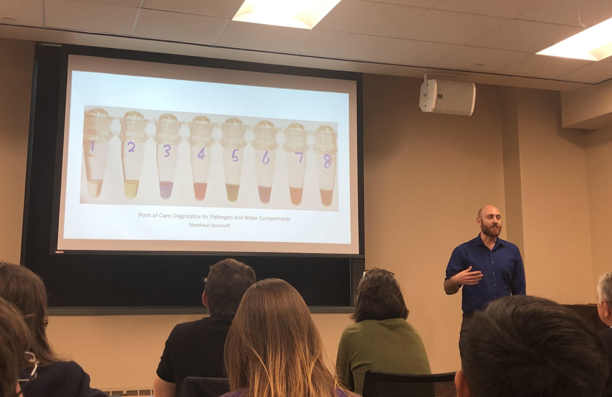 Congratulations to Matt Verosloff for winning NU’s Civil and Environmental Engineering “My research in 180 seconds” flash talk competition! This competition featured great work going on throughout NU, from increasing the sterility in hospitals to creating buildings for life on Mars. Matt succinctly conveyed his contributions to the first wave of the Lucks Lab’s point-of-care diagnostic platforms, namely PLANT-dx for plant pathogens and Rosalind for an array of water contaminants. His work involves democratizing diagnostic technologies by harnessing the power of synthetic biology to allow people to cheaply and quickly monitor the world around them.