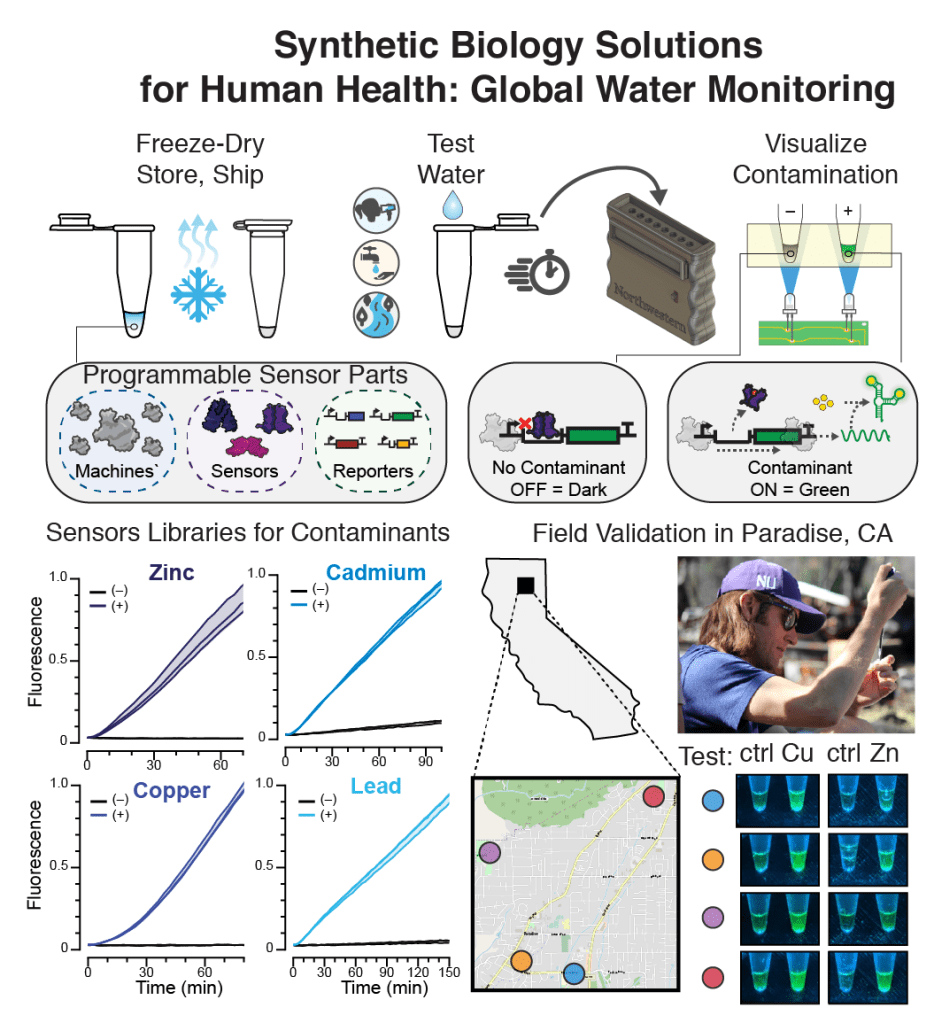 Our early work in this area has focused on addressing the emerging water crisis that affects global public health. This includes using the fluoride riboswitch to develop a fluoride water quality diagnostic, developing a new concept of “metabolic biosensing” by which metabolism is used to break down a target molecule into one that can be sensed by a transcription factor, to create a diagnostic for the endocrine-disrupting herbicide atrazine, and devising a new platform that uses RNA genetic circuitry, called RNA Output Sensors Activated by Ligand INDuction (ROSALIND) to fix limitations of protein transcription factor specificity and sensitivity to create a panel of sensors for toxic metals (lead, copper, cadmium), antibiotics (tetracyclines, macrolides) and consumer products (salicylate, benzalkonium chloride). We have also begun to transition this technology out of the lab and into the world by demonstrating that these systems work in the field. Our current questions in this space are bold and ambitious: Can we sense anything, anywhere? We are addressing this through developing new sensors for human and environmental health, and new downstream signal processing components to make sensors more robust. We have also adapted this research area into developing new COVID-19 diagnostics that can scale to meet demand.